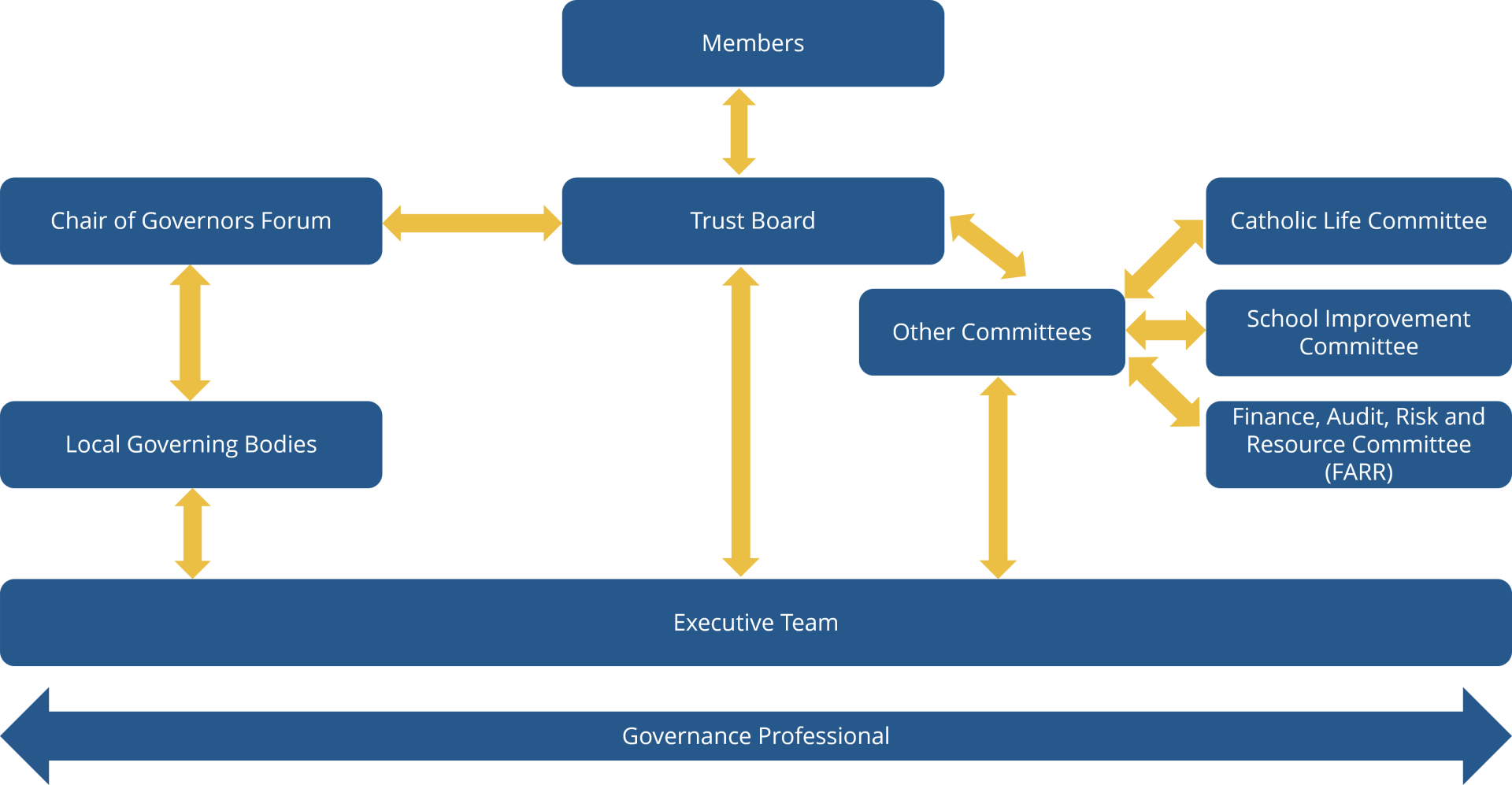 Our governing board is an integral part of the strategic running of our school and core members of our St Edmund Arrowsmith leadership team. Our whole-Trust governing team ensures best practice in three layers of accountability. On a local level, Local Governing Bodies (LGBs) like ours hold each Headteacher to account for what is delivered in their academy, each LGB at PFCMAT has a strong level of responsibility for their school's progress and success through our Trust's governing principle of subsidiarity. Our Directors are responsible for the strategic priorities of the Trust and our Members Board ensure compliance with charity and Company law requirements.