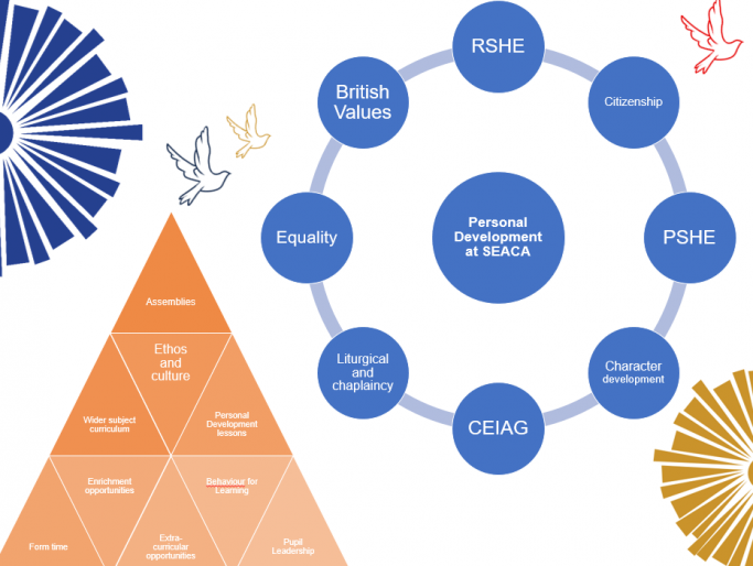 Stemming from our mission statement of every pupil at SEACA experiencing 'life in all its fullness', through our Personal Development curriculum we seek to develop every member of our school community as a well-rounded individual who is equipped with the keys to open doors and the courage to feel they can open them. The Personal Development curriculum equips our pupils with essential knowledge that will enable them to make informed decisions about their health and wellbeing, relationships, career aspirations and their contribution to the local, national and global community. The Personal Development curriculum also develops our pupils' strength of character and builds their self-efficacy. It develops pupils' capacity to make sound decisions when facing risks and challenges and supports our pupils in knowing how and when to ask for help and how to access support.