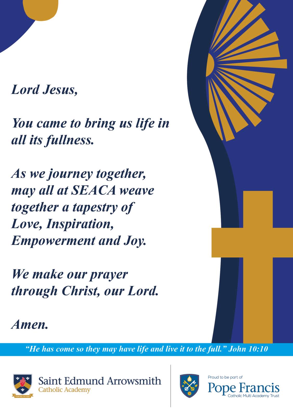 Prayer and liturgy are intrinsic and essential elements in our endeavour to educate the whole person, one who experiences ‘life in all its fullness’, and are much more than the statutory requirement for a daily act of worship for all pupils. Prayer and liturgy at SEACA is Christ-centred and an integral part of school life rooted in the Catholic tradition, reflecting the values of the Gospel.